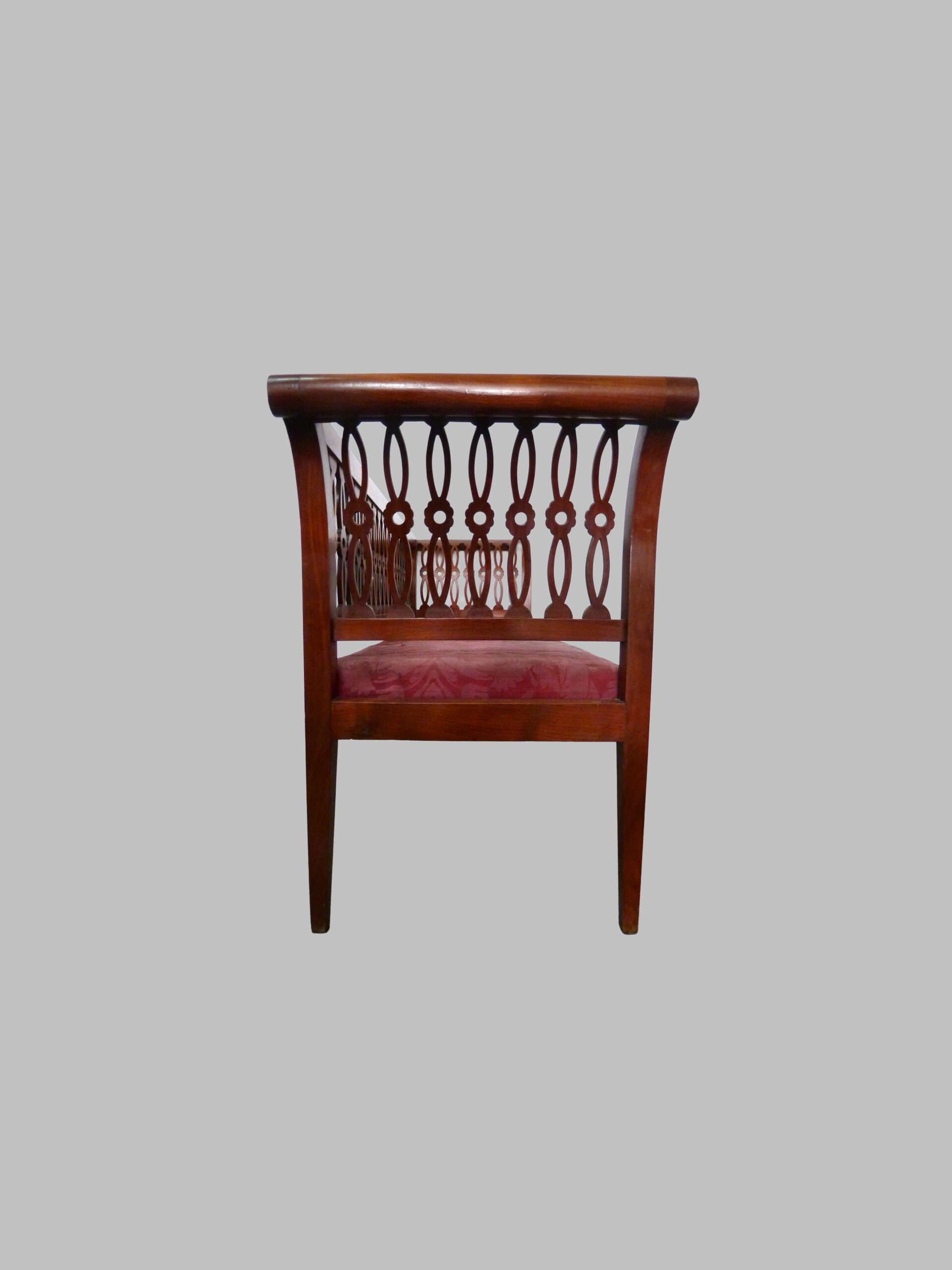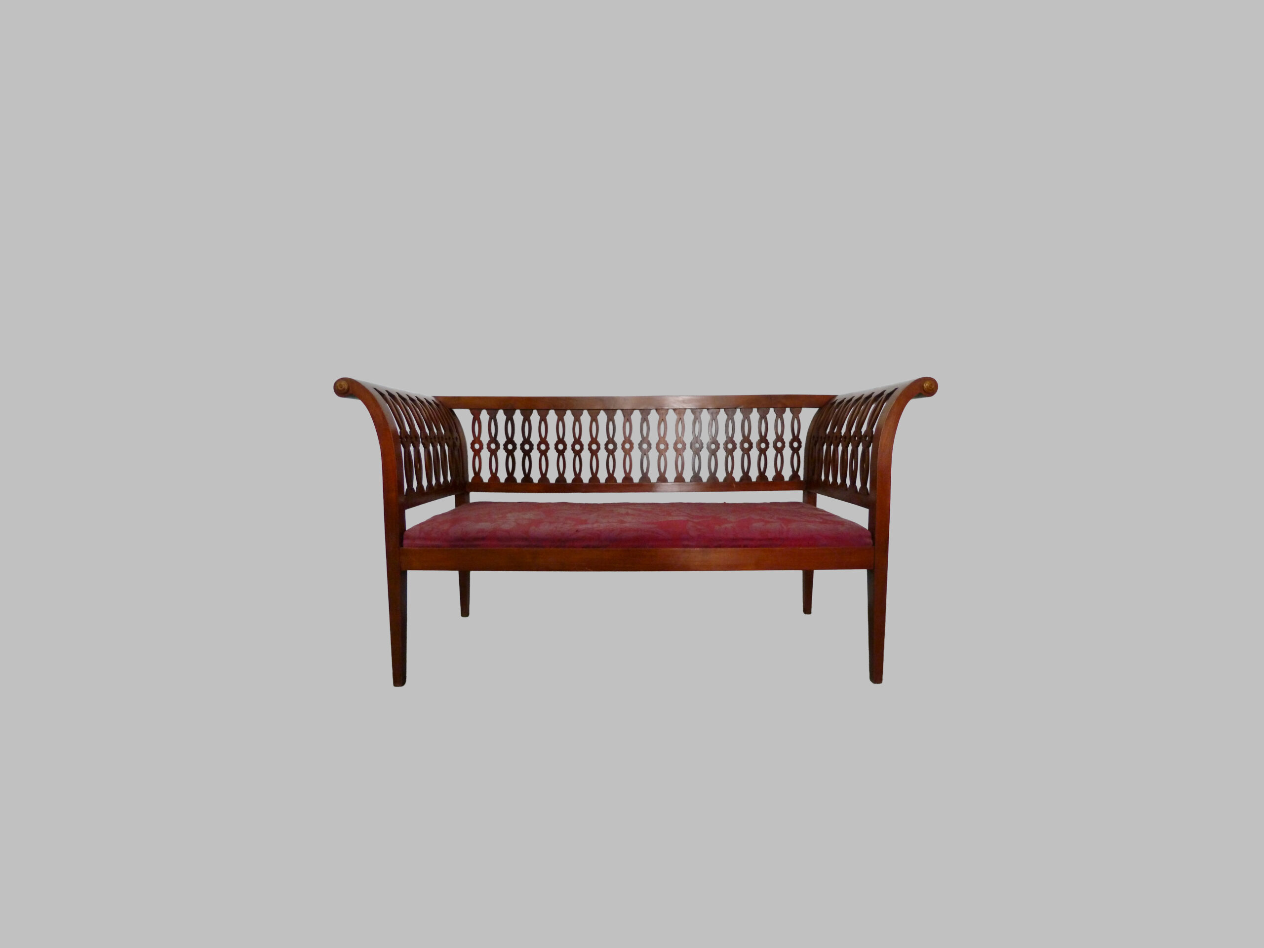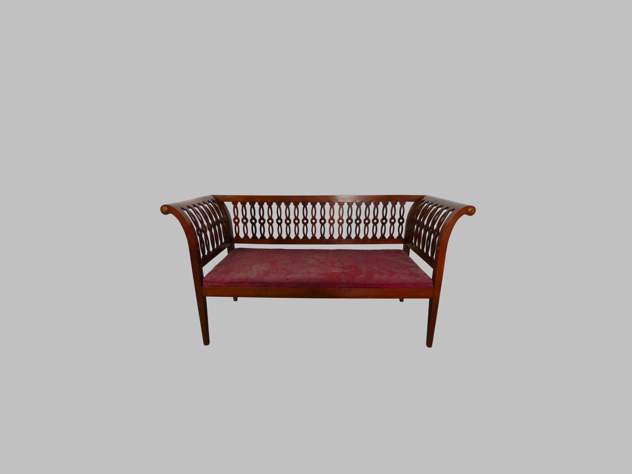 Sofá menorquín de estilo Imperio, realizado en caoba maciza y datado alrededor de 1800, que refleja la sobriedad y elegancia del mobiliario neoclásico español.