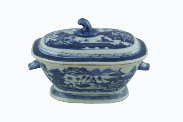 Octagonal tureen in white and blue Canton porcelain, with two handles in the shape of a pig’s head and decorated with oriental landscapes.