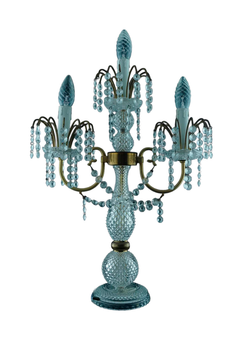 Table lamp in bronze and carved rock crystal, with a round base and hanging strips of round and faceted crystals.