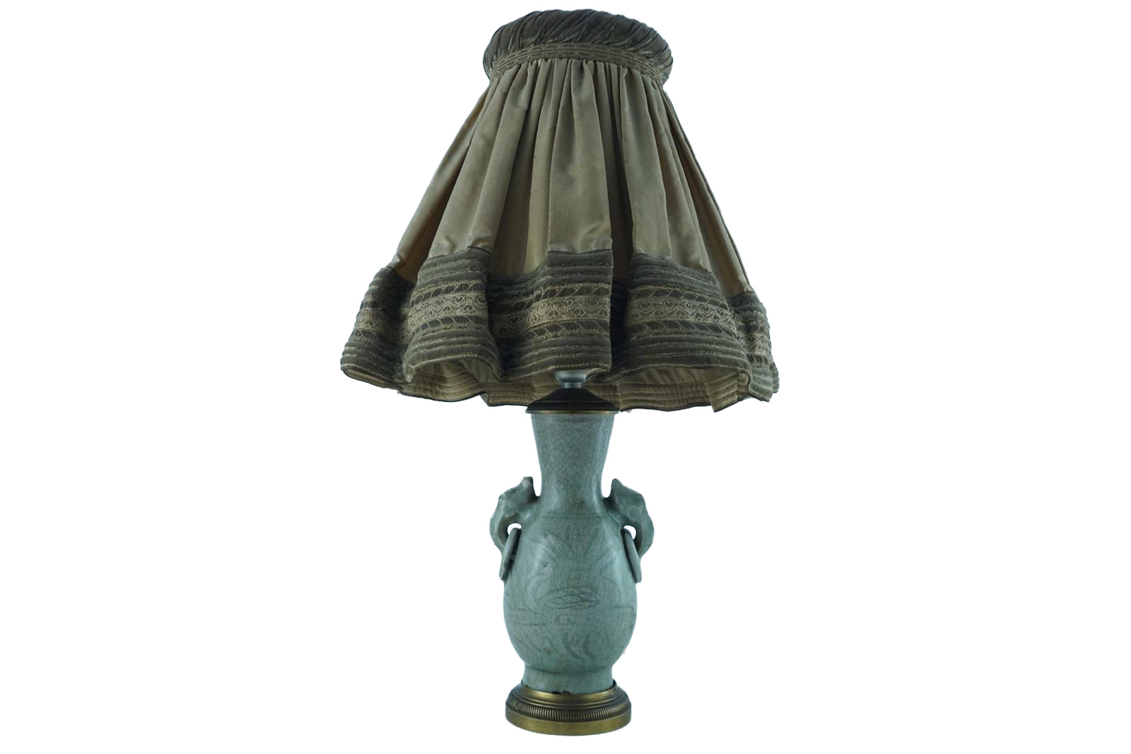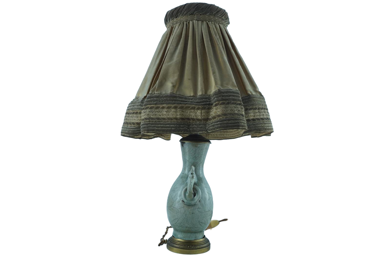 Table lamp with a Celadon ceramic foot in the shape of a vase with two handles, a gilt metal base and a fabric lampshade with antique embroidered.