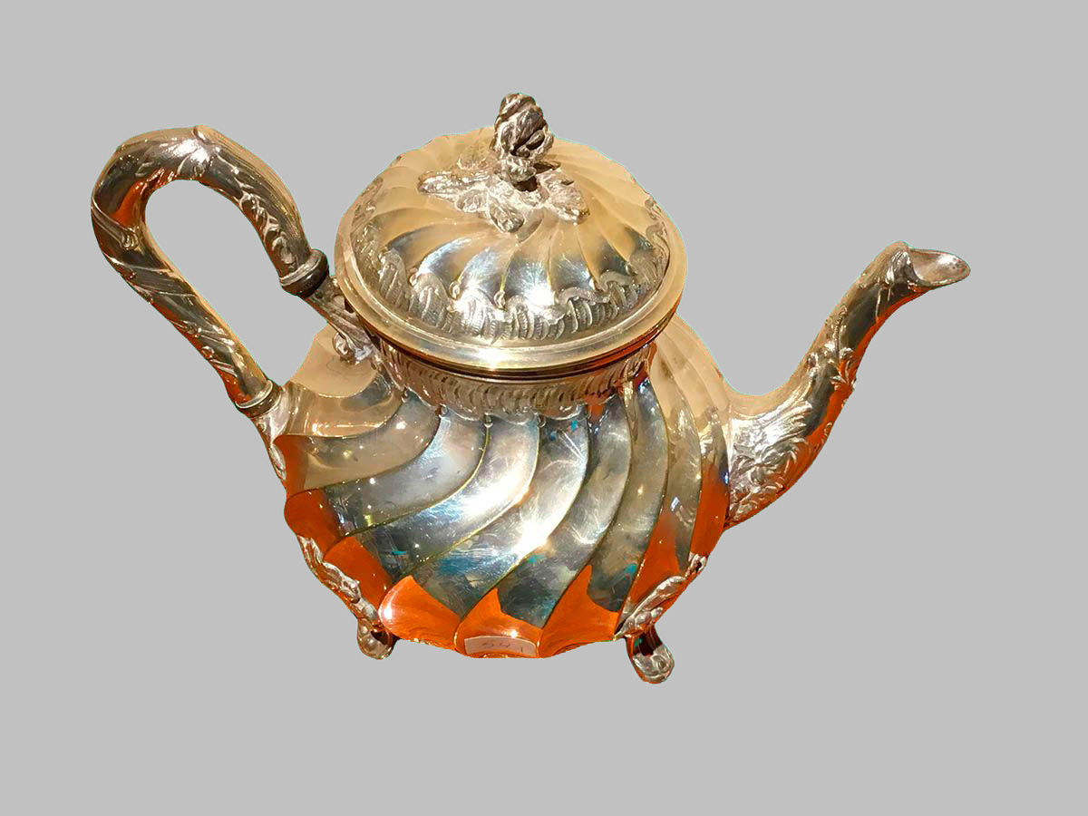 Refinada tetera de plata con asa, representativa del diseño artesanal francés del siglo XIX.