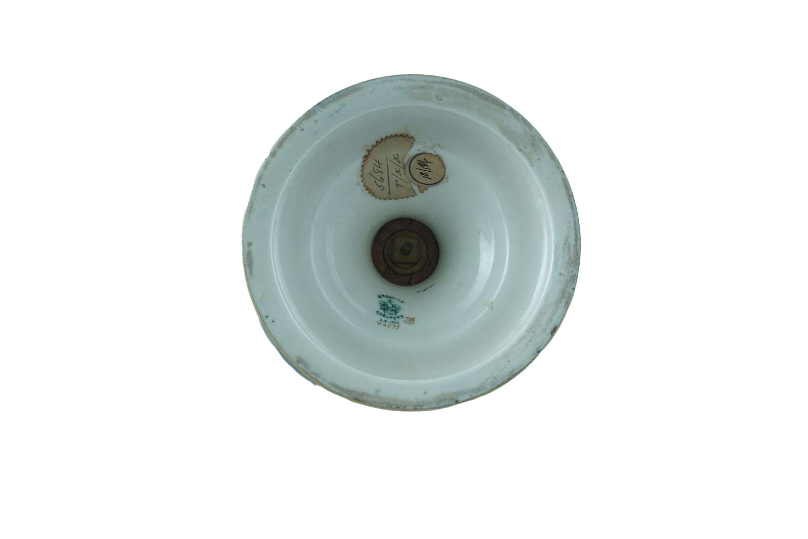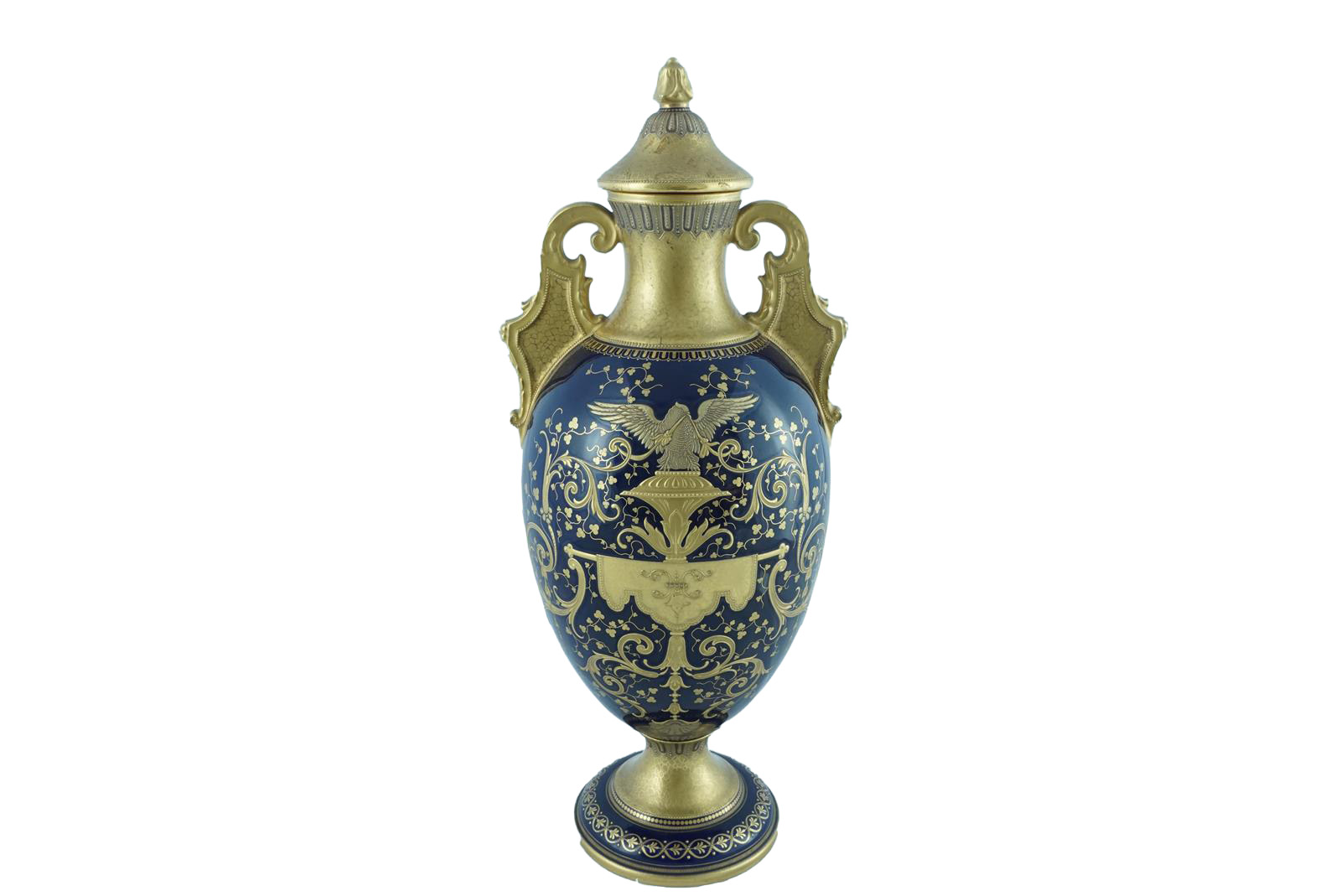 Тибор с крышкой и двумя фарфоровыми ручками угольного порта, синим и золотым. Англия, конец XVIII века.