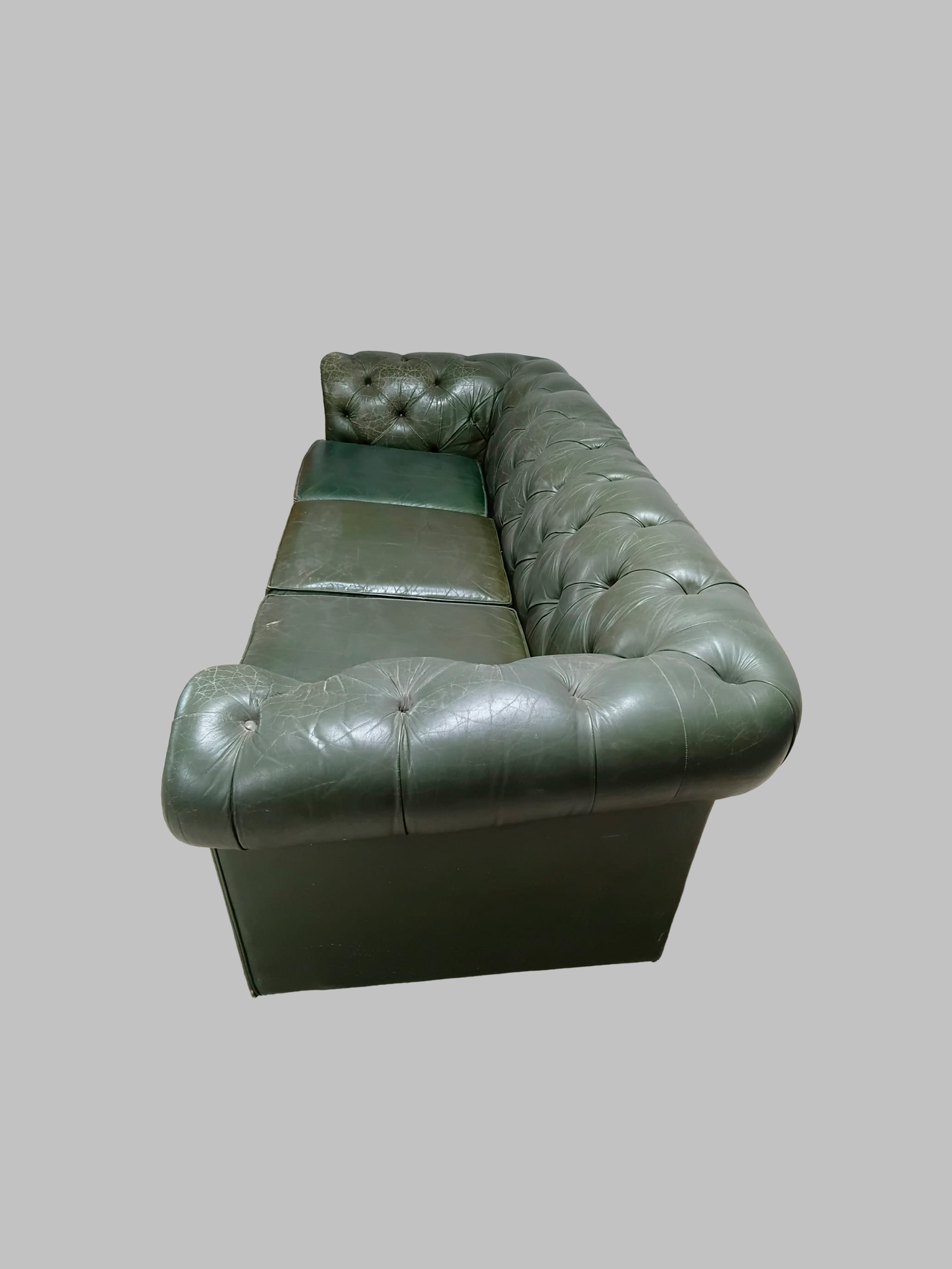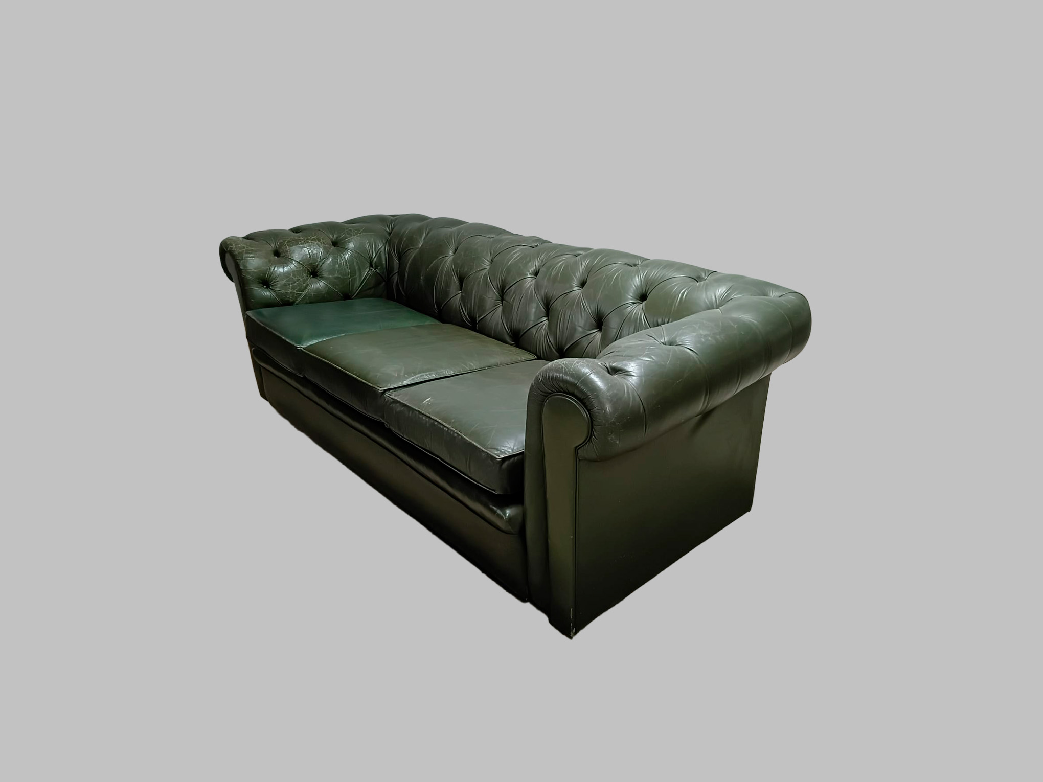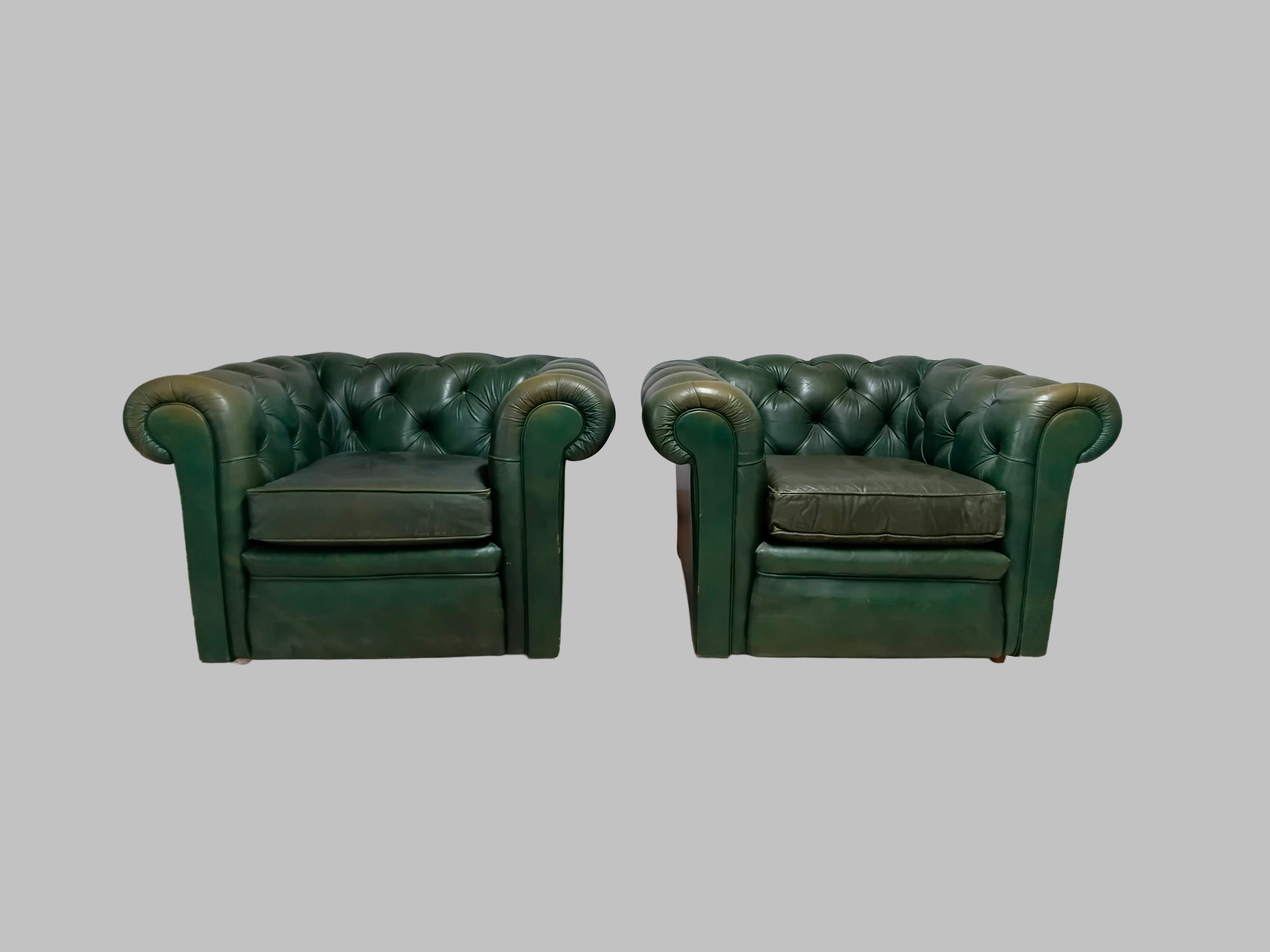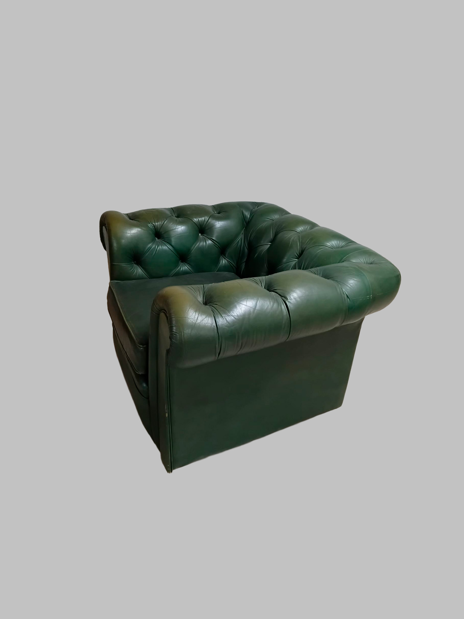 Conjunto tresillo Chester, compuesto por un sofá y dos butacas tapizados en piel verde de alta calidad, que combina comodidad, sofisticación y estilo atemporal.