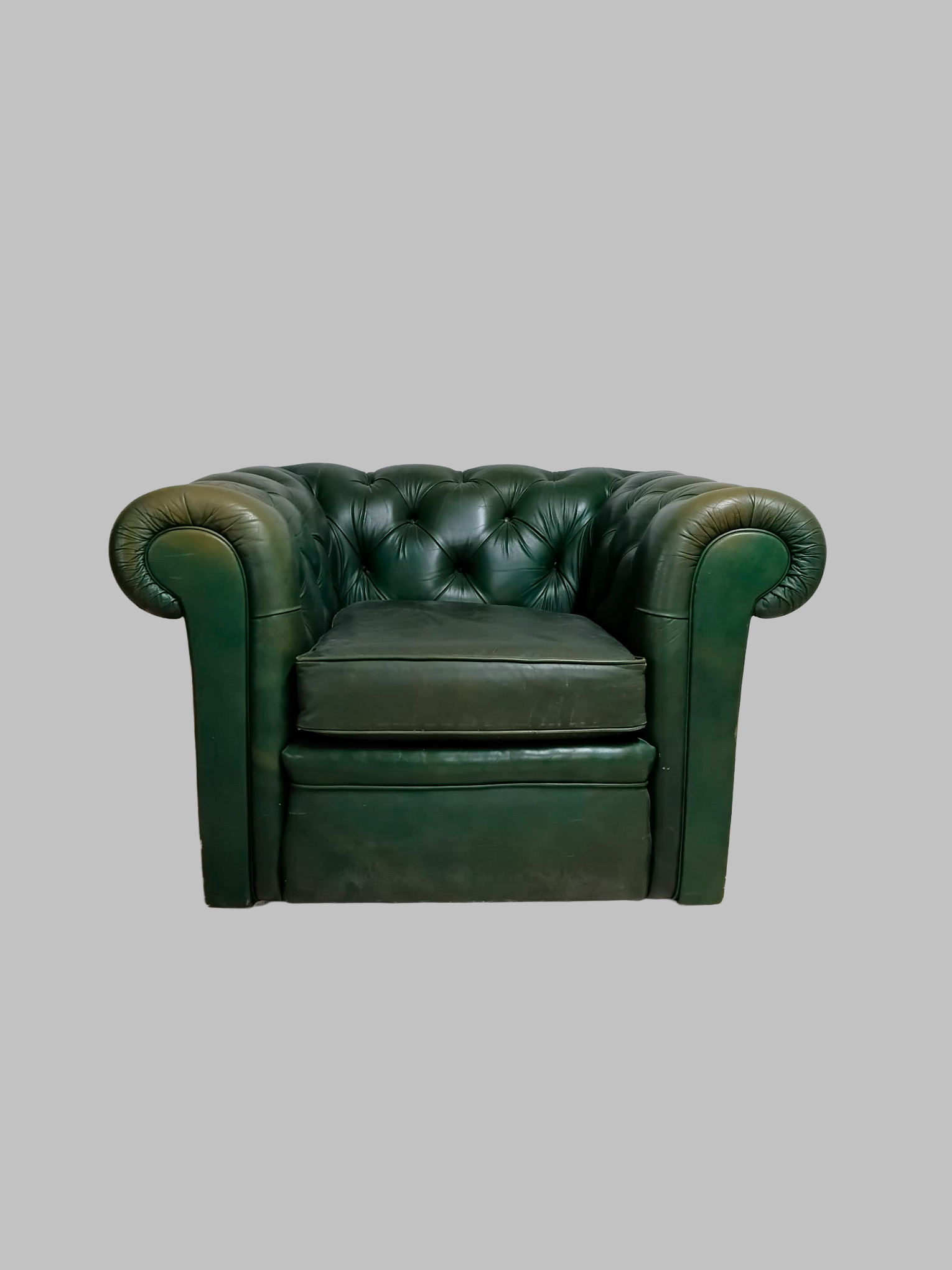 El diseño Chester clásico se caracteriza por su capitoné en el respaldo, brazos enrollados y estructura robusta, aportando un aire elegante y distintivo a cualquier espacio. La piel verde añade un toque de color sofisticado, mientras que su acabado suave y resistente garantiza durabilidad y confort prolongado.
