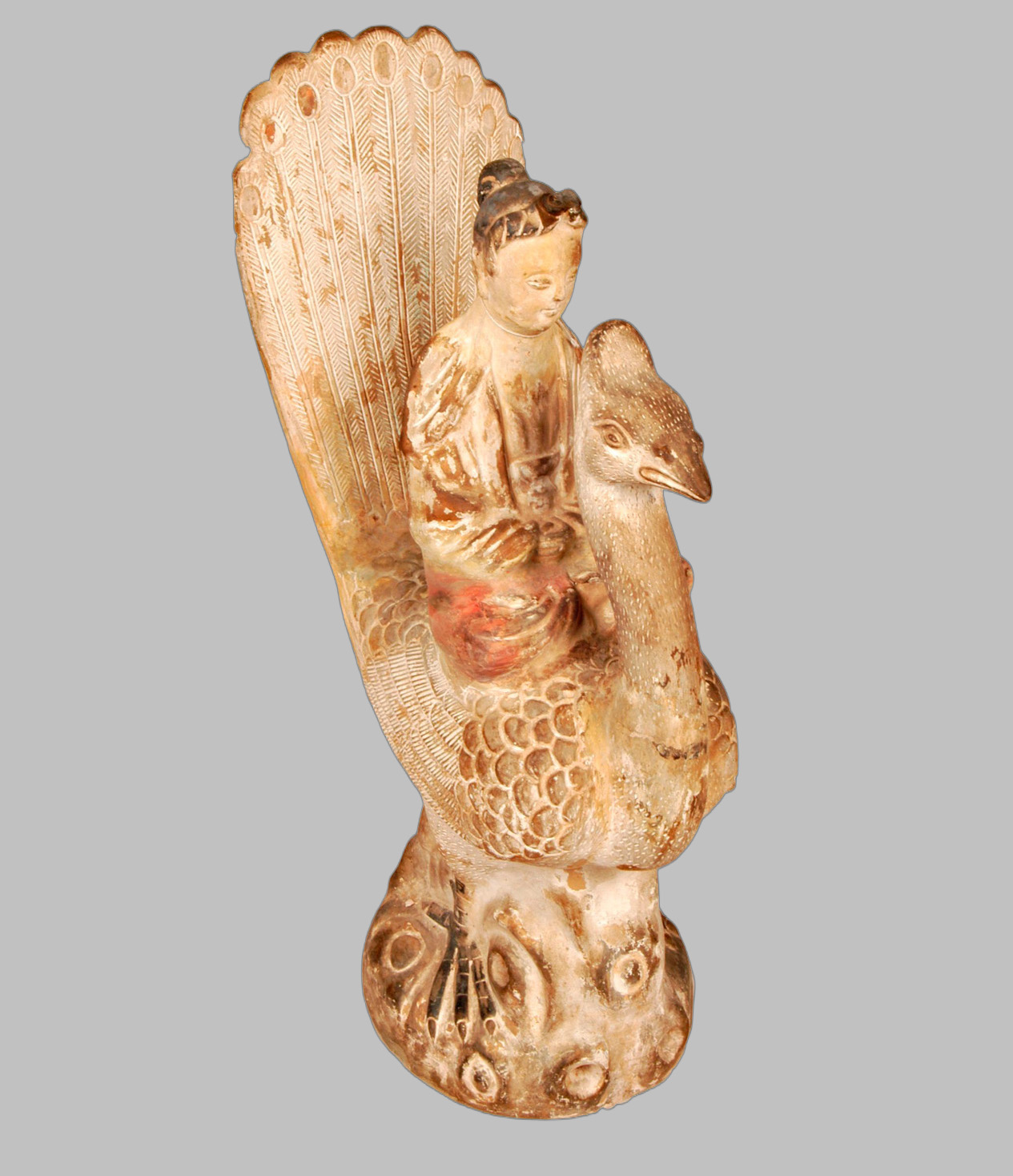 The figure represents an oriental character on a peacock.