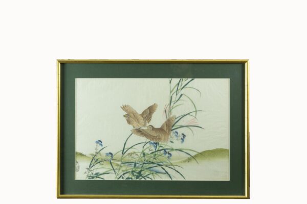 Watercolor on rice Paper with golden frame: Drawing with two birds and branches with blue flowers.